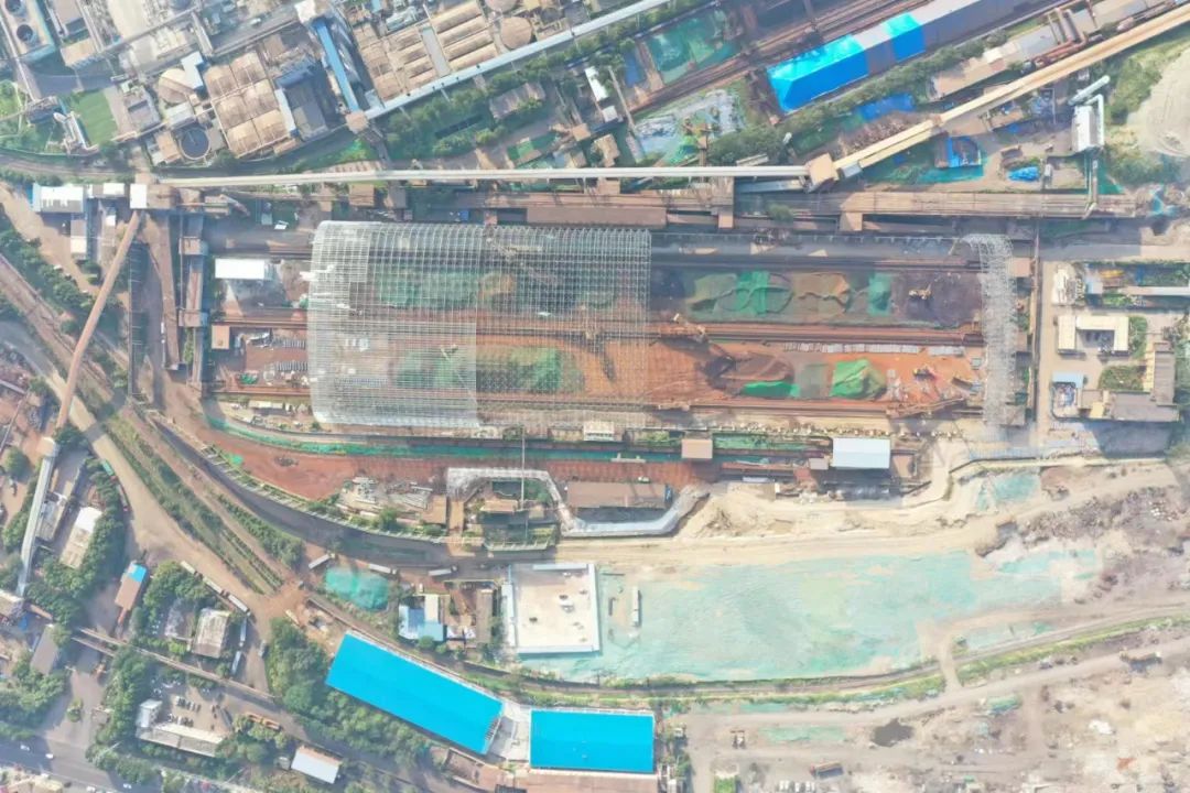老區(qū)一次料場封閉料棚網(wǎng)架長度363米、寬度106米、高度42米,展開面積70000平方米。6月23日驕陽似火炎炎的夏日,揮汗如雨,料棚起步架順利吊裝對接完成,掀起了大干熱潮。